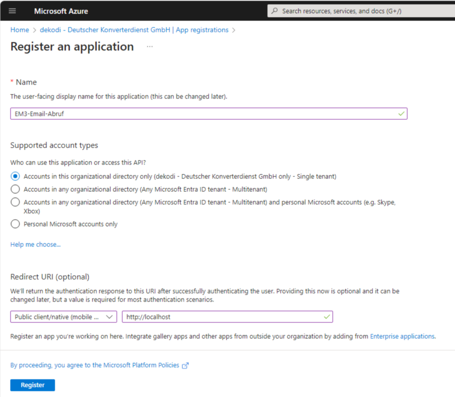Abb. App-Registration erstellen